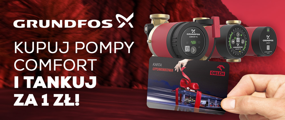 - Warunek otrzymania premii zawartej w pkt. 4.: za zakup dwóch pomp Grundfos Comfort (PO-GRU-CC00-150140) w czasie trwania akcji, Klient nabywa kartę podarunkową Orlen za 1 zł netto