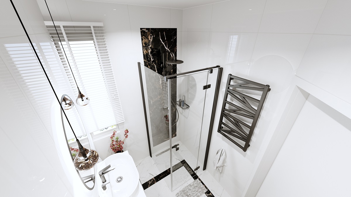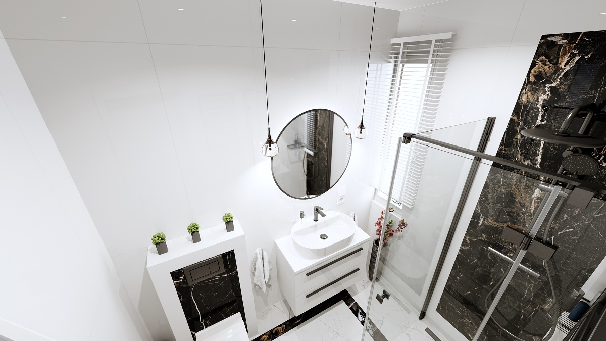 Biel w postaci wielkoformatowych płytek na cianie i imitacji marmuru na ścianie to bardzo dobra baza do dalszego urządznia wnętrza. W tej aranżcji projektanci postawili na eleganckie czarne elementy. Maksymalnie wykorzystano dostępną przestrzeń, dlatego pomieszczenie jest nie tylko piękne, ale też funkcjonalne.