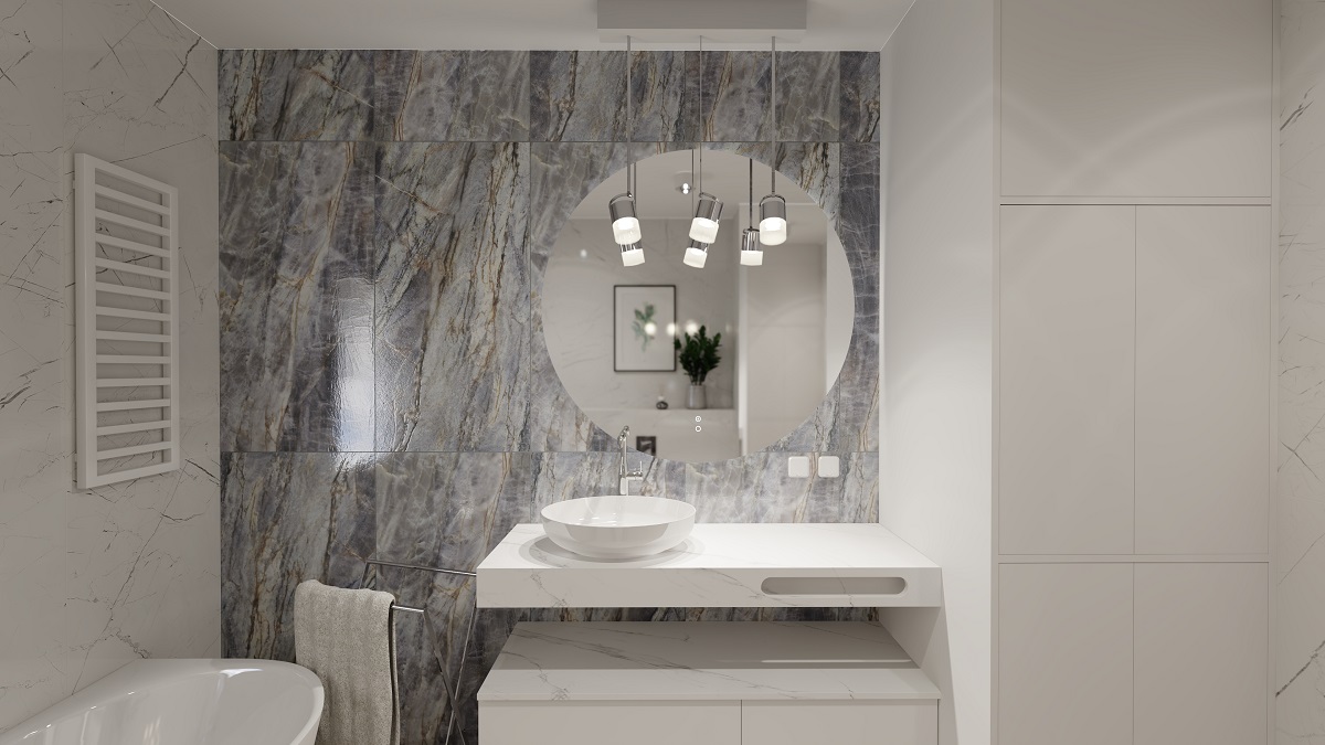 Bazą do urządzania tej łazienki są płytki imitujące marmur z szarymi żyłkami. Nawiązują one do dekoracyjnej ściany, która stanowi tło dla umywalki, lustra i blatu. Pomieszczenie jest bardzo subtelne i jednocześnie nowoczesne ze względu na armaturę w srebrnym kolorze i dobrze dopasowane dodatki.