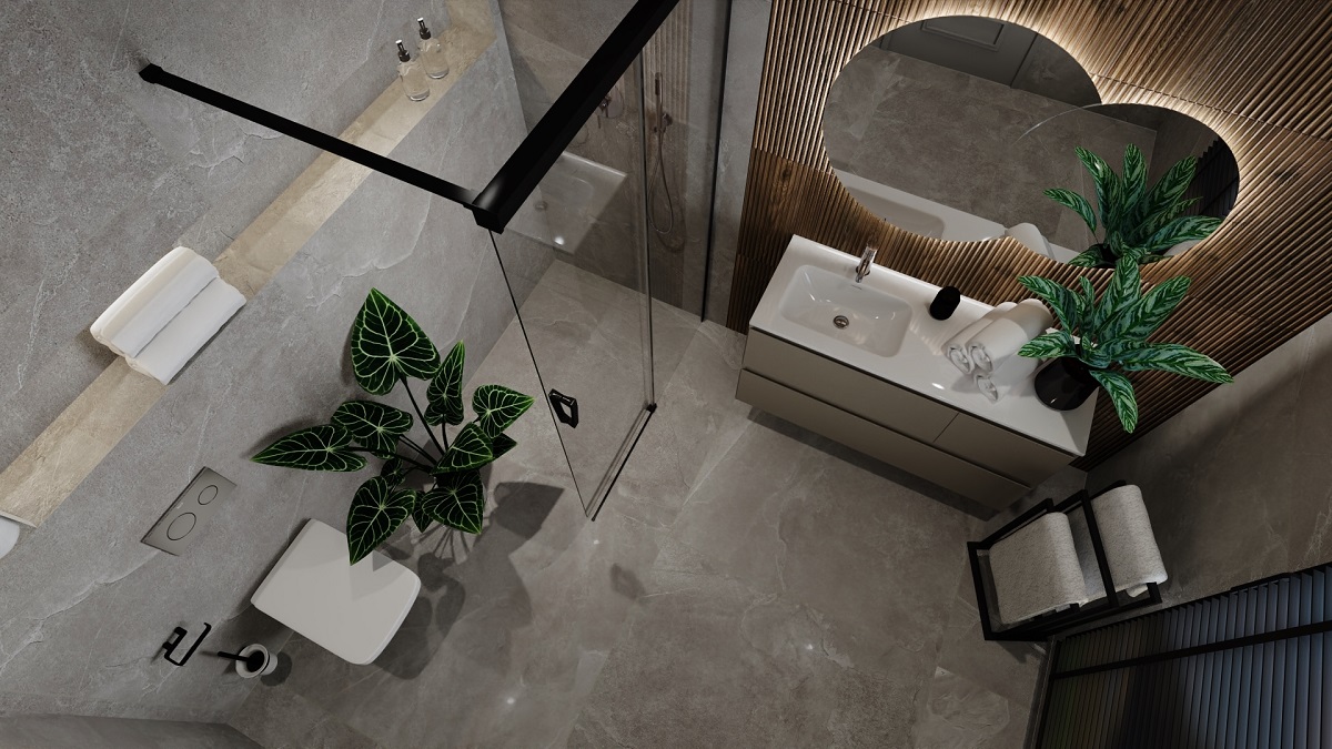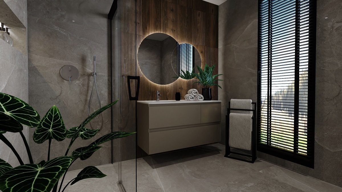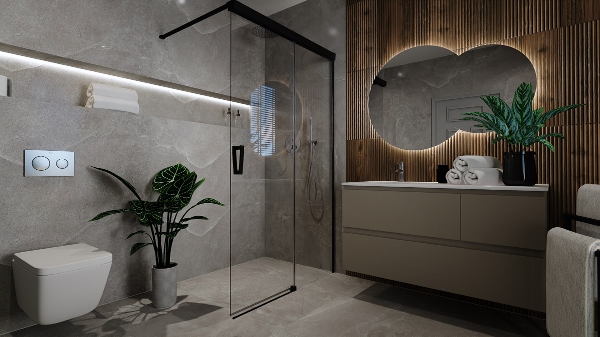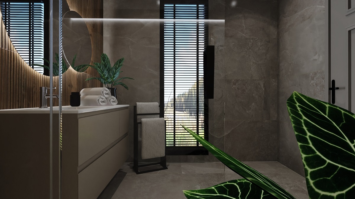 Poniższa wizualizacja prezentuje bardzo nowoczesną łazienkę, w której dominują odcienie szarości. Warto jednak zwrócić uwagę również na wszechobecną roślinność, duże i dobrze oświetlone lustro oraz funkcjonalnie zaprojektowaną strefę prysznicową z odwodnieniem liniowym. Takie rozwiązanie pasuje do nowoczesnego, industrialnego wnętrza i dodaje całości minimalistycznego sznytu.